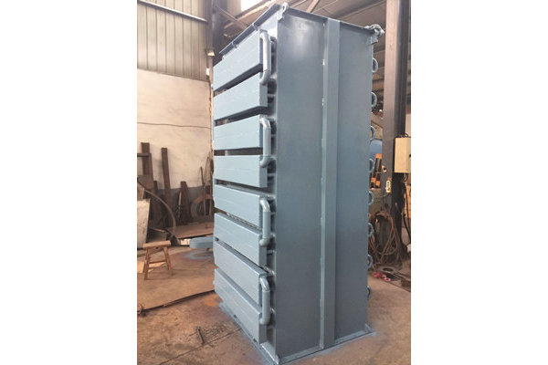 1、冷却单元内均匀交错密布水冷管,型砂冷却过程中与水冷管管壁充分接触,增加了冷却速度及砂处理量。各冷却单元间紧密连接,进出水口交错放置,确保水温温度满足冷却要求,且进水口在冷却单元下方,出水口在冷却单元上方,使得冷却水在冷却单元内部循环时间长,充分利用。